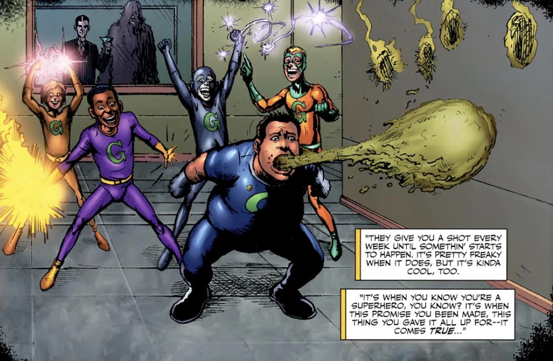 At the G-Mansion, Godolkin has brunch with the G-Men and G-Force members where he offers a speech about the teams' fabricated status as outcasts and supposed discrimination by "humanity" (even though Godolkin has no powers whatsoever and Supes in this universe generally being far from oppressed) that causes G-Men like Five-Oh to jeer at their leader for thinking himself as one of them. During the brunch, Critter brings up the recruitment of Bagpipe, and the sheer number of G-Men there were now, warning him (like Vought before him) how the growing membership also brought the increasing likelihood of security breaches or a rogue G-Man exposing their terrifying secrets to the public. Critter then begs Godolkin to stop kidnapping children to create more spin-off teams, but he stubbornly refuses, stating “For good or ill, my children- - I just can’t seem to stop.”